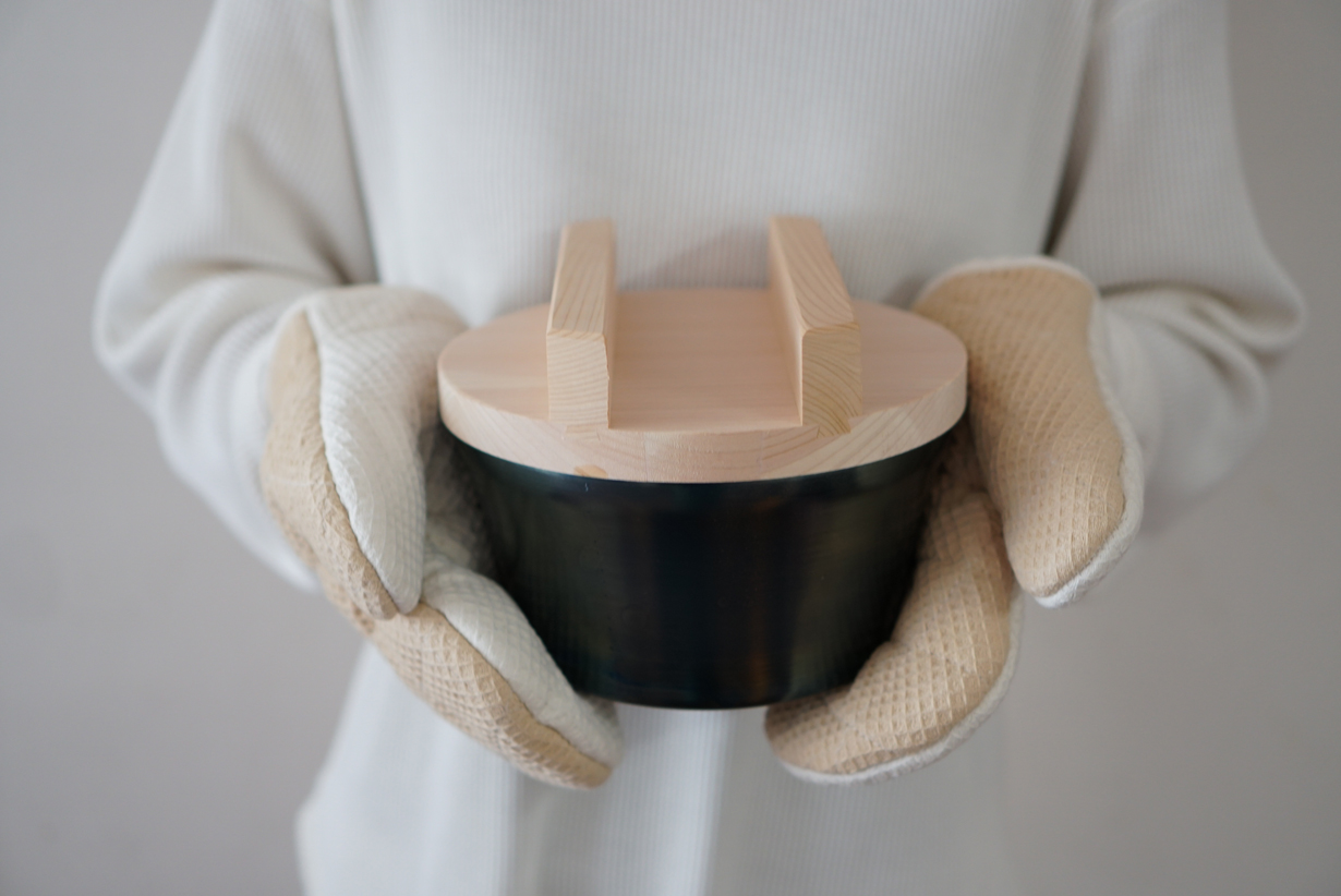 外側に向かって緩やかに広がる曲線フォルムと、二本取っ手を備えた国産さわらの木蓋を採用。鉄鍋の重厚感と木の温もりが調和し、食卓にやさしい印象を与えます。